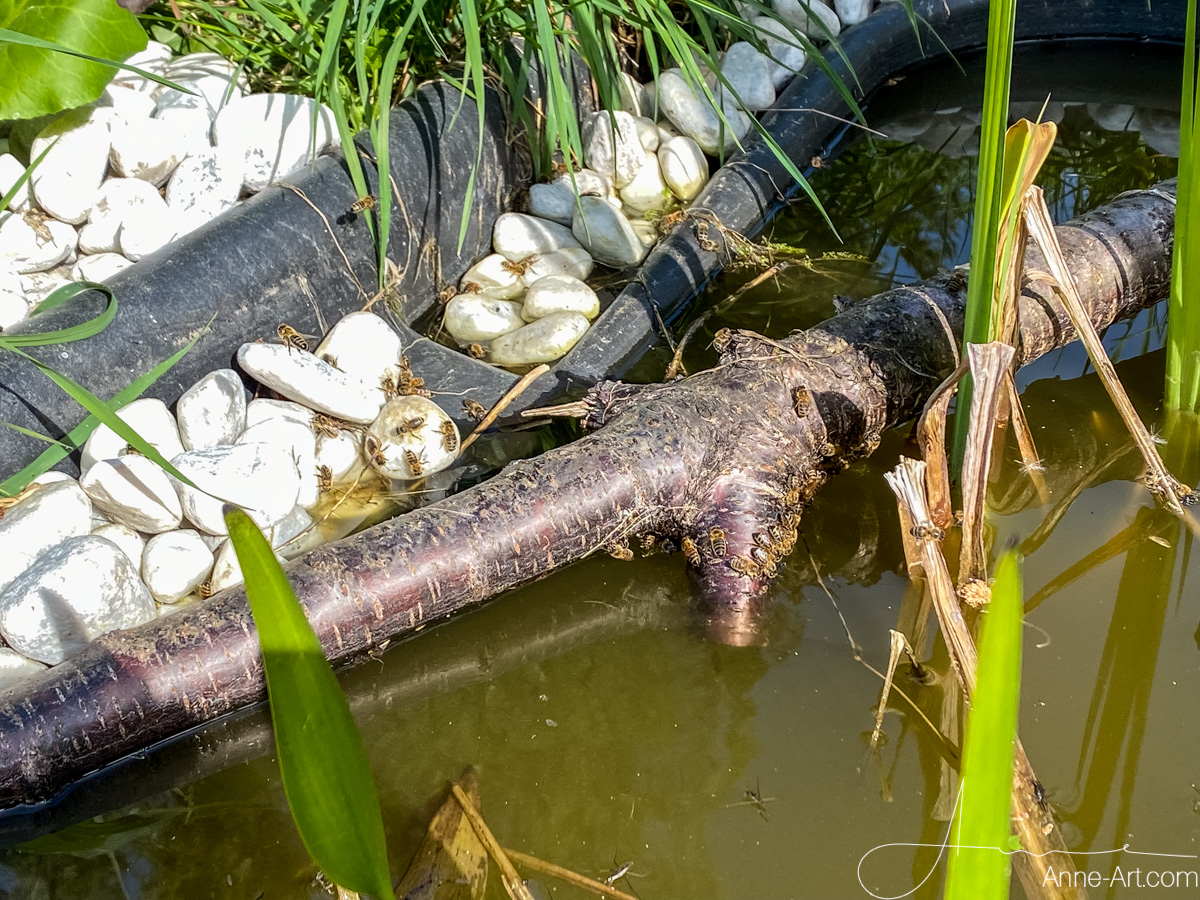 Auf jeden Fall sind, wie in unseren Regentonnen, überall Stöcke und große Rindenstücke im Wasser, damit sich möglichst jedes Tier allein wieder rausziehen kann. Entspricht wahrscheinlich mal wieder nicht dem Garten-Schönheits-Ideal. Aber das ist egal.
