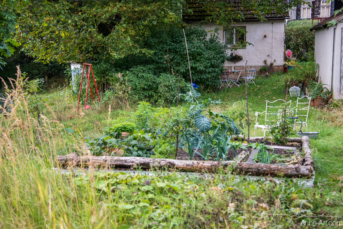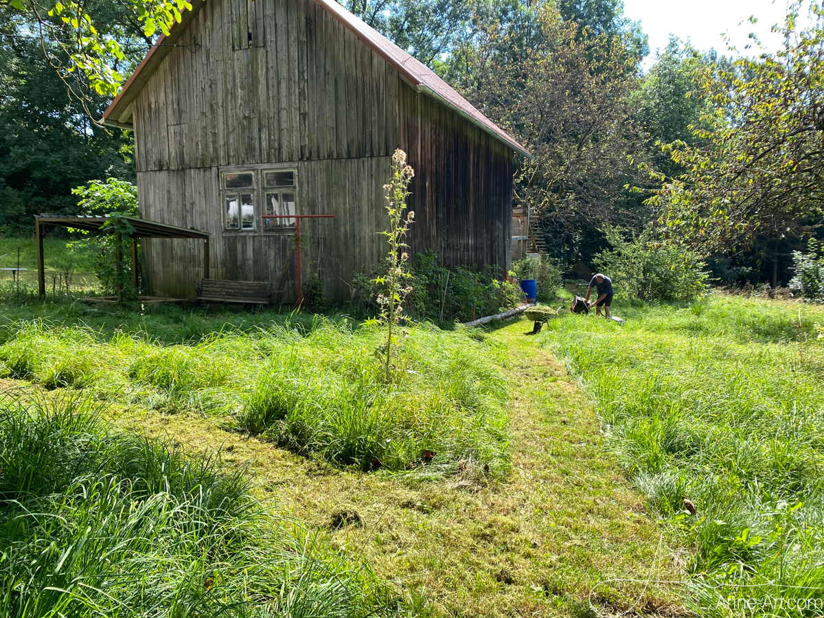Für die Wege, die wir mähen, nehmen wir die Sense und falls eine Gartenparty mit Gästen geplant ist, auch ausnahmsweise mal den Rasenmäher. „Spießerwege“ schimpft mein Mann – aber da hier wirklich kein gerader Boden ist, haben sie sich gut bewährt. Kein beschädigter Fuß und kein Sturz. Weder Tags noch Nachts.