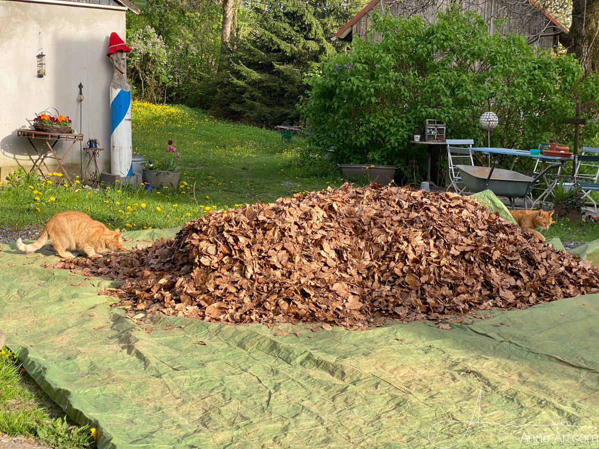 Im Ort sind wir inzwischen so ein wenig verschrien als „Die-können-wirklich-alles-brauchen“. So landen in unserem Garten die Birkenschösslinge aus der Osterzeit als Rankhilfen für Tomaten und Co. Wenn das Buchenlaub an der Itzquelle in Gemeinschaftsarbeit zusammengebracht wird, das Laub unter der Linde weggeholt oder auch diese beschnitten wird – bei uns findet alles einen Platz und eine Aufgabe – Im Hochbeet, als Mulch, als Hühnereinstreu oder Zaun.