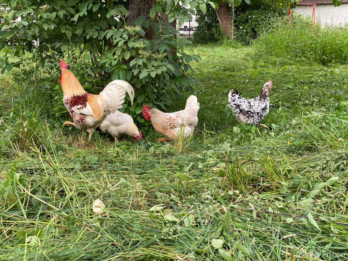Die Hühner feiern das Mähen übrigens – was sich da dann alles finden lässt. Doch keine Angst – die Wiesenfläche ist so groß, dass die kleine Schar nur punktuell schmaust. Wir lassen das Heu ein bis zwei Tage – je nach Wetter – liegen und aussamen. Danach kommt es auf einen großen Haufen – da braucht es noch eine andere Lösung. Aber kommt Zeit, kommt Idee.